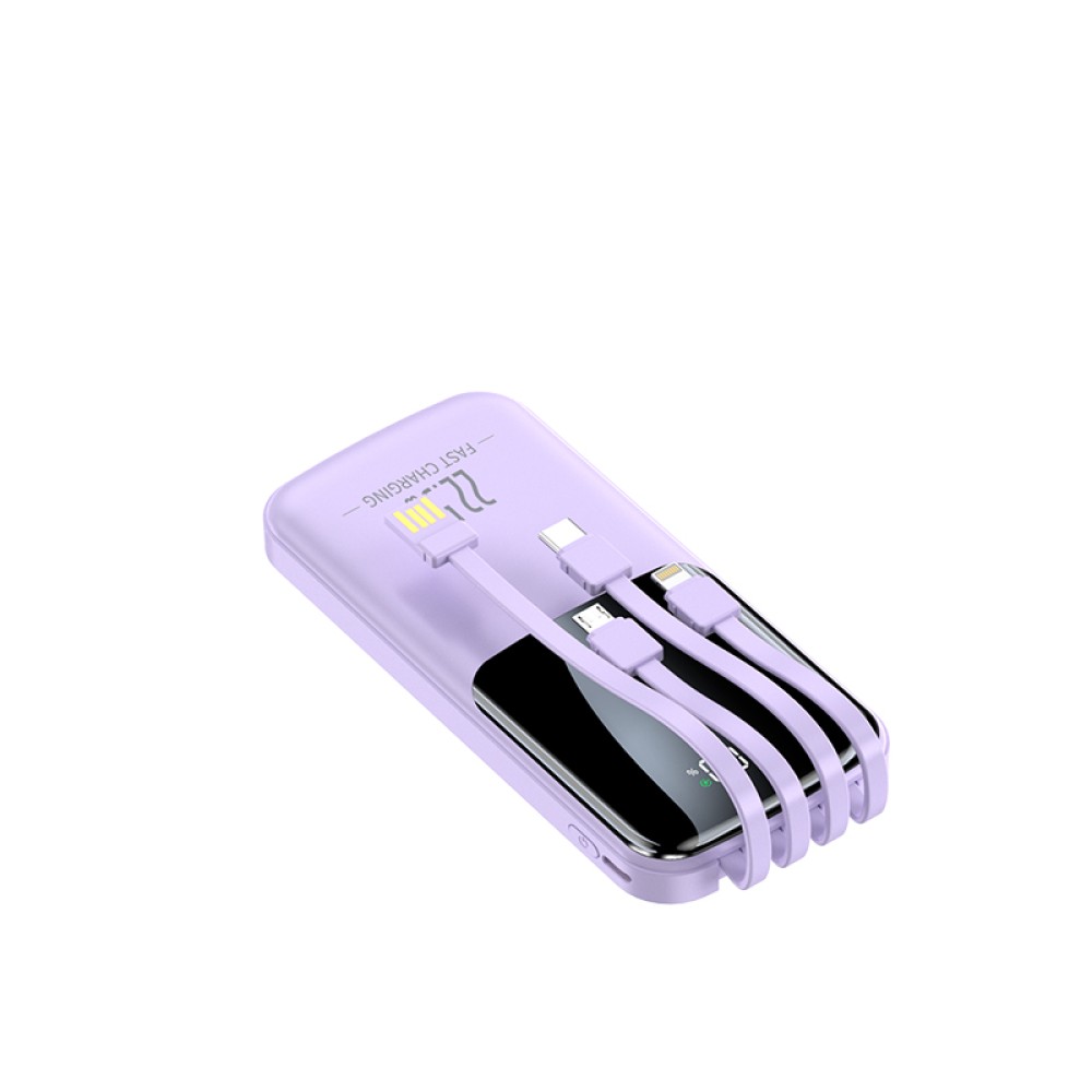 Внешний аккумулятор ёмкостью 10 000 мА·ч с четырьмя встроенными кабелями и цифровым дисплеем уровня заряда. Универсальный формат для зарядки разных устройств без дополнительных проводов — смартфонов, наушников и аксессуаров. Быстрая зарядка PD доступна через порт USB-C; встроенные кабели работают в стандартном быстром режиме.