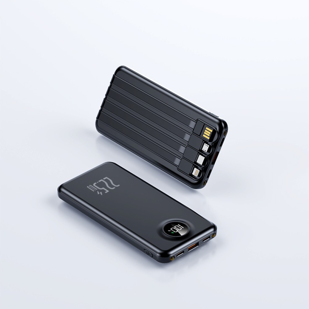 Ультратонкий внешний аккумулятор ёмкостью 10 000 мА·ч с четырьмя встроенными кабелями, цифровым дисплеем и встроенным фонариком. Формат «всё в одном» позволяет заряжать разные устройства без дополнительных проводов. Быстрая зарядка PD доступна через порт USB-C; встроенные кабели работают в стандартном быстром режиме.