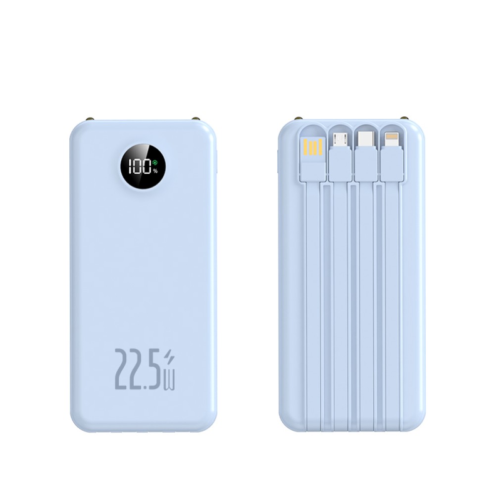 Ультратонкий внешний аккумулятор ёмкостью 10 000 мА·ч с четырьмя встроенными кабелями, цифровым дисплеем и встроенным фонариком. Формат «всё в одном» позволяет заряжать разные устройства без дополнительных проводов. Быстрая зарядка PD доступна через порт USB-C; встроенные кабели работают в стандартном быстром режиме.